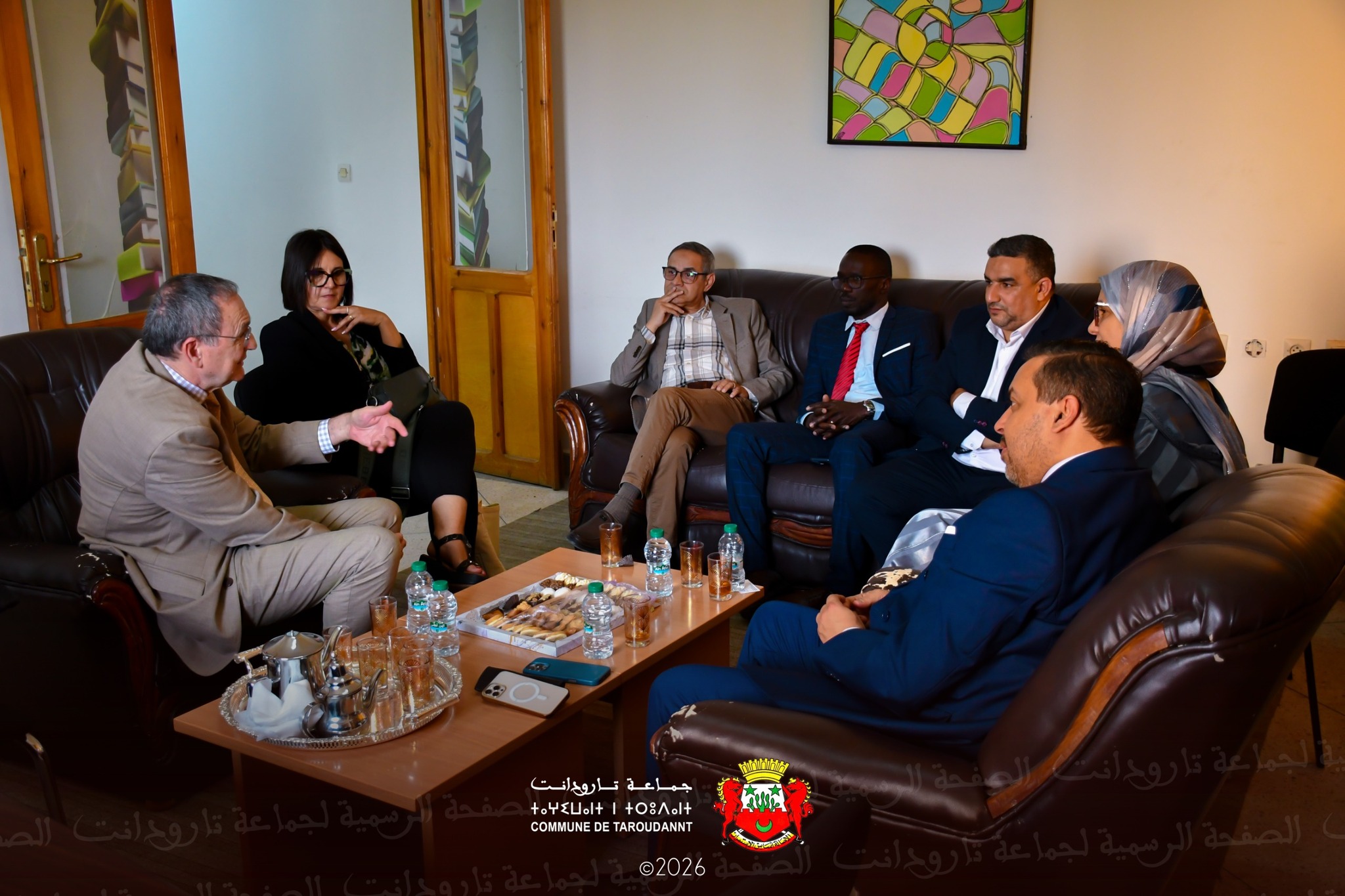 استقبل السيد محمد أمهرسي النائب الأول لرئيس الجماعة الترابية لتارودانت يومه الجمعة 17 أبريل 2026 بمقر الخزانة البلدية ، السيد Sylvain BERGER، القنصل العام الفرنسي بأكادير بالنيابة و المدير المنتدب بالنيابة للمعهد الفرنسي بأكادير مرفوقا بالسيد Mamadou WADE ، مسؤول مركز اللغة و التعاون التربوي، والسيدة Nadia MOURADI، مسؤولة عن العلاقات بالمعهد الفرنسي، بحضور السيد مصطفى المرتقي ، مدير المصالح الجماعية ، و السيد سمير الشيهب ، نائب غرفة الصناعة التقليدية سوس ماسة، و السيد عبدالمنعم المناني رئيس قسم الشؤون الإدارية و العمل الاجتماعي و السيدة فاطمة الزهراء شهاب رئيسة مصلحة الشؤون الثقافية و الاجتماعية والرياضية والإعلام والعلاقات العامة والتواصل.