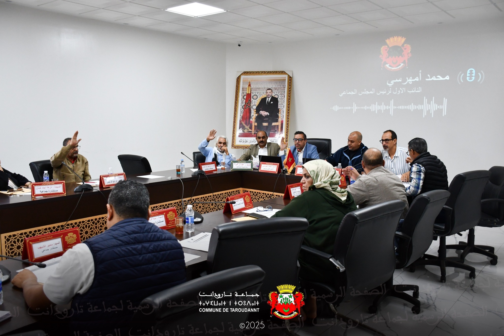 وترأس هذه الجلسة السيد محمد امهرسي، النائب الأول لرئيس المجلس الجماعي لتارودانت، بحضور السيد كرم عنات، باشا مدينة تارودانت، وأعضاء المجلس الجماعي، والسيد مدير المصالح الجماعية، بالإضافة إلى أطر وموظفي الجماعة.
