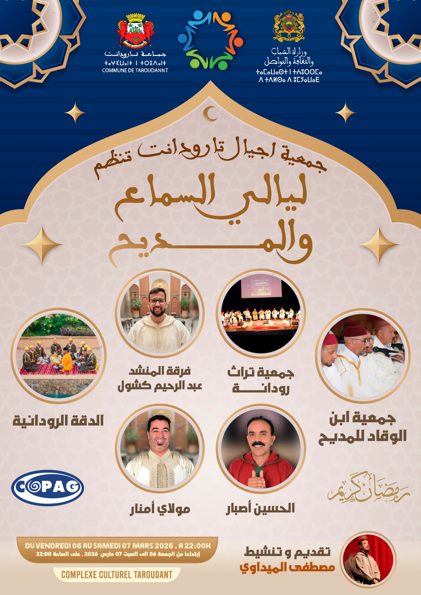 بشراكة مع جماعة تارودانت تنظم جمعية اجيال تارودانت ليالي السماع و المديح و ذلك يومي 06 و 07 مارس 2026 بالمركز الثقافي تارودانت