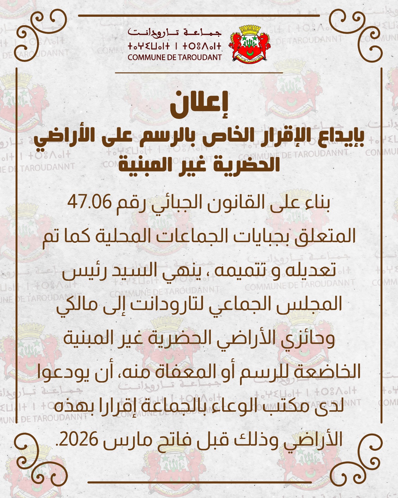 بناء على القانون الجبائي رقم 47.06 المتعلق بجبايات الجماعات المحلية كما تم تعديله و تتميمه ، ينهي السيد رئيس المجلس الجماعي لتارودانت إلى مالكي وحائزي الأراضي الحضرية غير المبنية الخاضعة للرسم أو المعفاة منه، أن يودعوا لدى مكتب الوعاء بالجماعة إقرارا بهذه الأراضي وذلك قبل فاتح مارس 2026.
